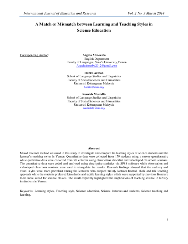 Pdf A Match Or Mismatch Between Learning And Teaching Styles In Science Education Angela Abu Asba Academia Edu